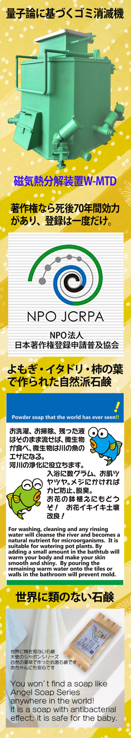 石けんのすすぎは魚の餌になり、 河川は綺麗になってゆく,本物の自然派ここにあり! 世界に類をみないものです。